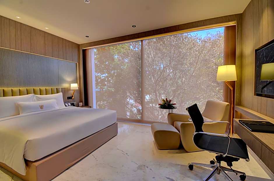 This double room features a tile/marble floor, soundproofing and sofa. It offers a view of the Bangalore Turf Club.